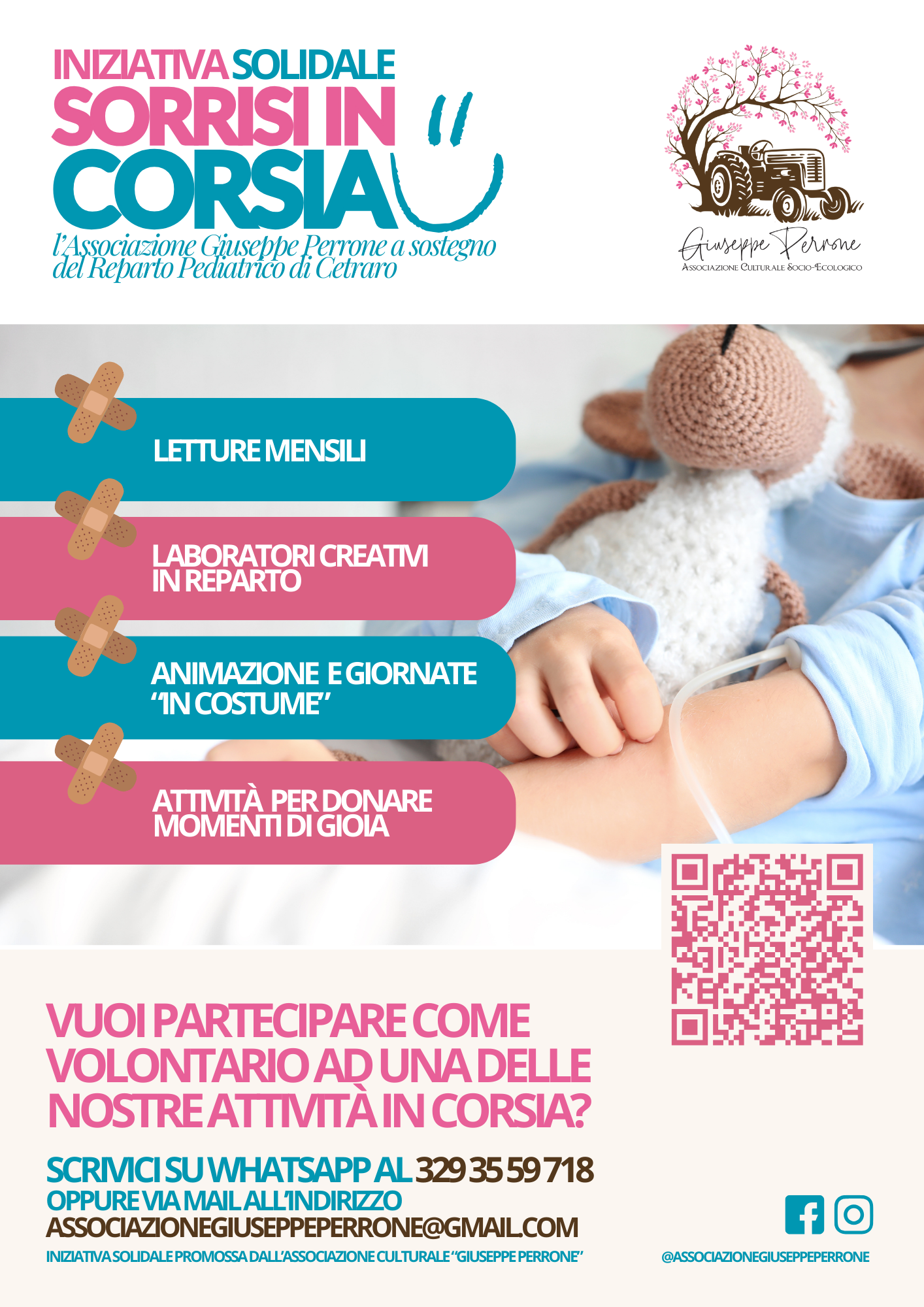 L’Associazione Giuseppe Perrone, in collaborazione con il Reparto di Pediatria dell’Ospedale di Cetraro, ha avviato l’iniziativa “Sorrisi in Corsia”, un progetto dedicato ai piccoli pazienti ricoverati, con l’obiettivo di rendere il loro soggiorno in ospedale più sereno e divertente.